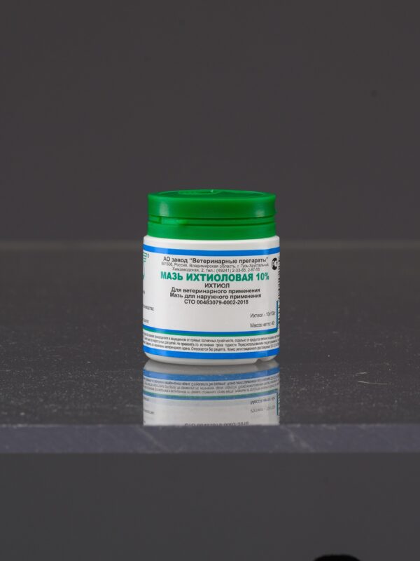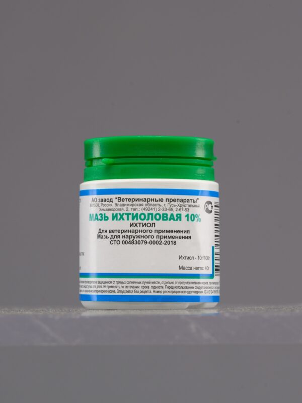 Мазь ихтиоловая 10% и 20% — для лечения ран, ожогов, дерматитов у животных. Оказывает антисептическое и противовоспалительное действие. При нанесении на раны суживает сосуды, уменьшает секрецию и экссудацию, а также ускоряет регенерацию поврежденной ткани.