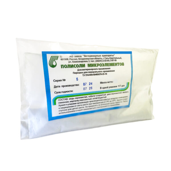 Полисоли микроэлементов — нормализует содержание микроэлементов в организме, улучшает переваривание и всасывание питательных веществ корма, профилактика нарушения минерального обмена, стимулирует рост и развитие, повышает резистентность организма.