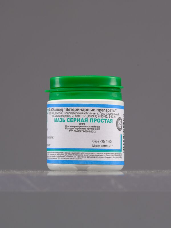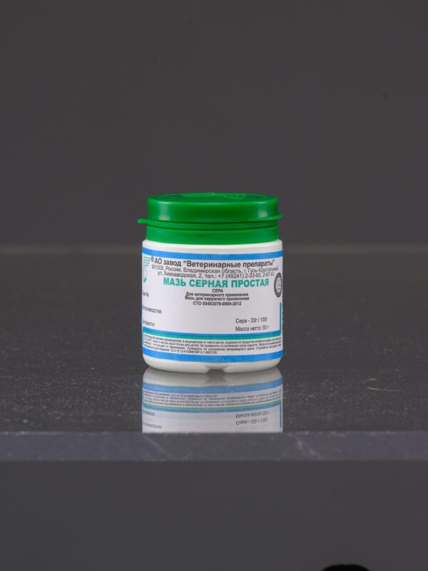 Мазь серная простая — обладает противовоспалительным, противомикробным и противопаразитарным действием. Предназначена для лечения кожных заболеваний (экземы, дерматиты, чесотка) у животных.