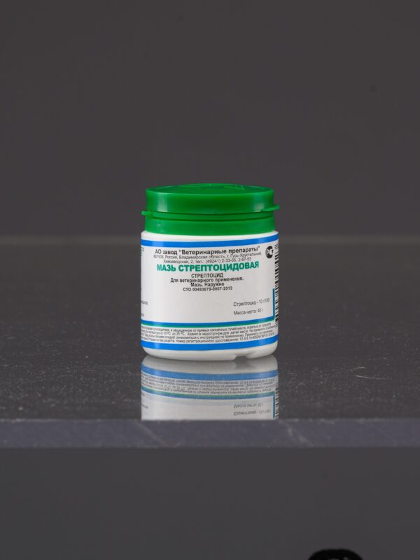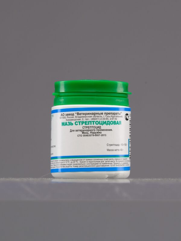 Мазь стрептоцидовая — применяется местно для ускорения заживления ран, язв, ожогов, трещин сосков вымени и других хирургических патологий у животных. Способствует уменьшению секреции и экссудации и ускорению процессов регенерации поврежденной ткани.